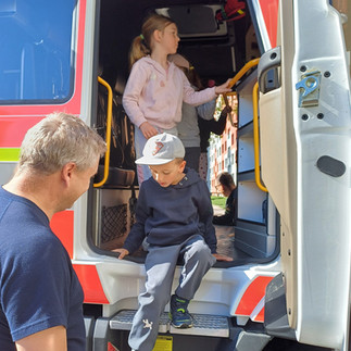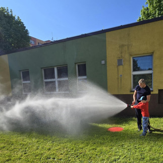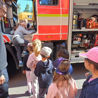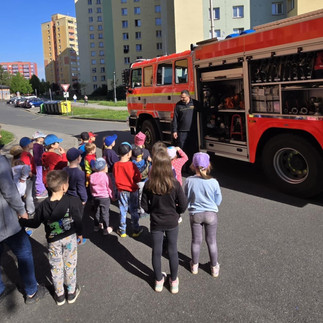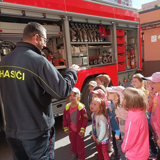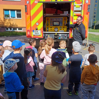 Seznámit děti se svým povoláním přijeli zástupci Střední odborné školy požární ochrany a Vyšší odborné školy požární ochrany ve Frýdku-Místku. Děti si prohlédly hasičské auto zvenku i zevnitř a vybavení hasičského vozu. Na zahradě si pak vyzkoušely, jaké to je hasit vodou z hasičské hadice.