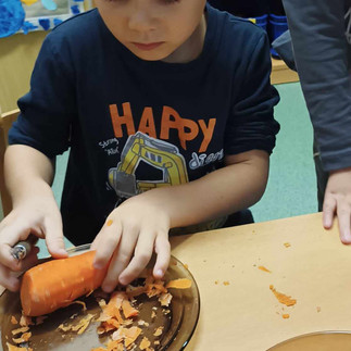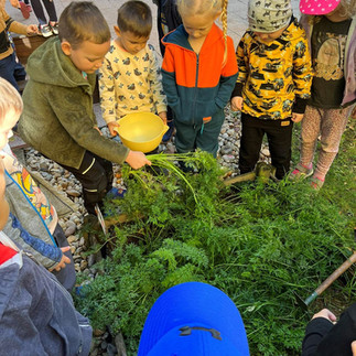 Tento týden jsme s dětmi sklidili mrkev, kterou jsme na jaře zaseli. Během jara a léta děti pozorovaly, jak mrkev roste a poctivě ji zalévaly. Rozhodli jsme se, že část mrkve sníme (abychom byli zdraví) a z další části si upečeme moučník. Děti mrkev oškrábaly, nastrouhaly (což vůbec nebylo lehké), umíchaly těsto a pak už se těšily, až budou moci ochutnat. Moučník se nám moc povedl, dali jsme si ho po obědě jako zákusek. Slupky z mrkve jsme naservírovali našim žížalákům do vermikompostéru, určitě si na nich taky smlsli. Děkujeme maminkám za přinesené suroviny a těšíme se na další pečení.